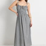 Rhapsody Black Cream Stripe Strappy Shirred Bodice Maxi Dress