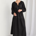 Wren Black Linen Blend SS Shirred Bodice Midi Dress