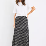 Faithful Black Geo Print Satin Bias Midi Skirt