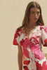 model wearing red white pink floral mini dress