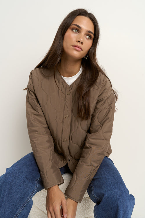 Woman wearing an oversized quilted mocha colored jacket with button front, styled with blue jeans and gold hoop earrings.