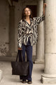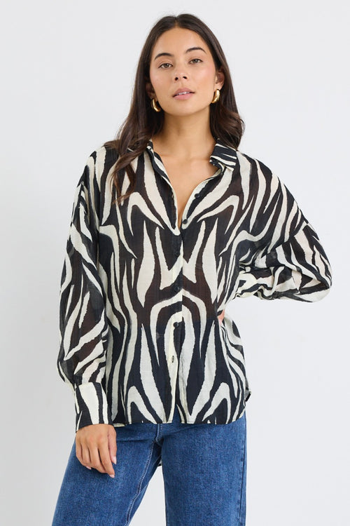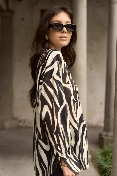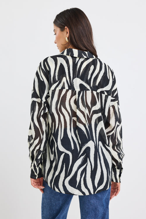 Model wears a black and white tiger print long sleeve button down shirt with jeans