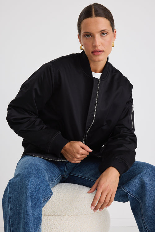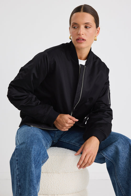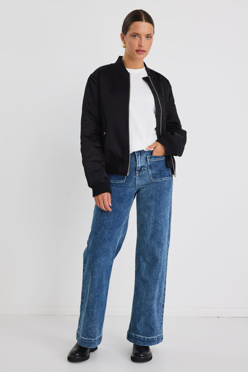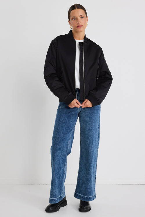Model wears a black bomber jacket with blue jeans.