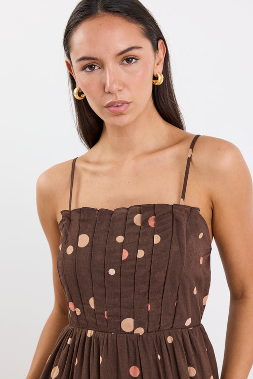 Bali Chocolate Multi Polka Dot Pleated Bodice Strappy Maxi Dress