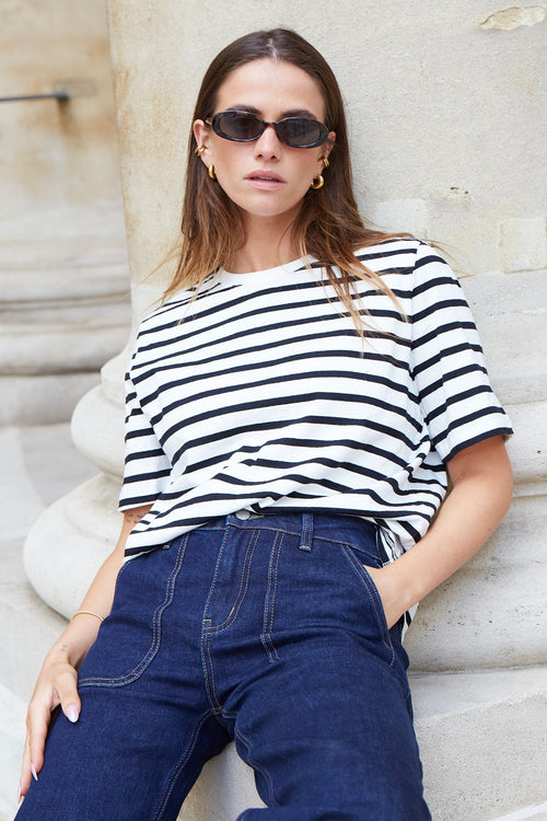 model wears a black and white stripe tee