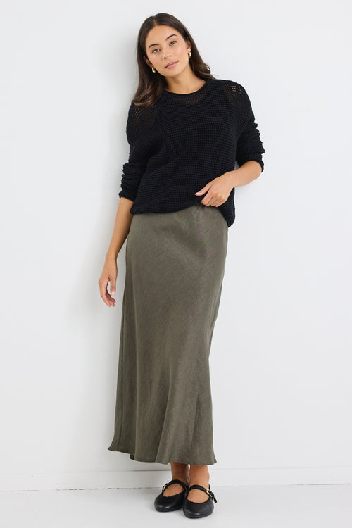 The Bliss Khaki Linen Bias Midi Skirt from Re: Union Label is a versatile midi skirt made from a linen blend, offering breathable comfort for various seasons. The bias-cut design drapes well, providing a comfortable yet stylish fit, making it the perfect midi skirt for everyday wear and dressing up for special occasions. Its midi length allows for diverse styling, fitting casual or dressier looks, paired with an elasticated waistband for added comfort. This midi skirt will make a perfect addition to your outfit rotation.