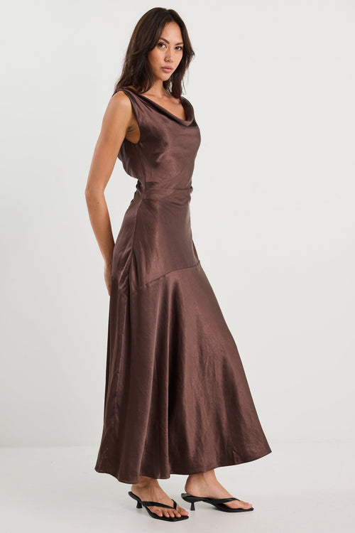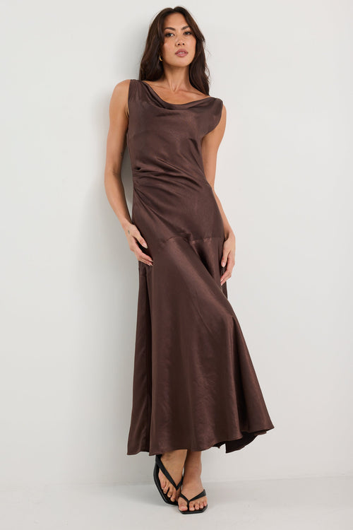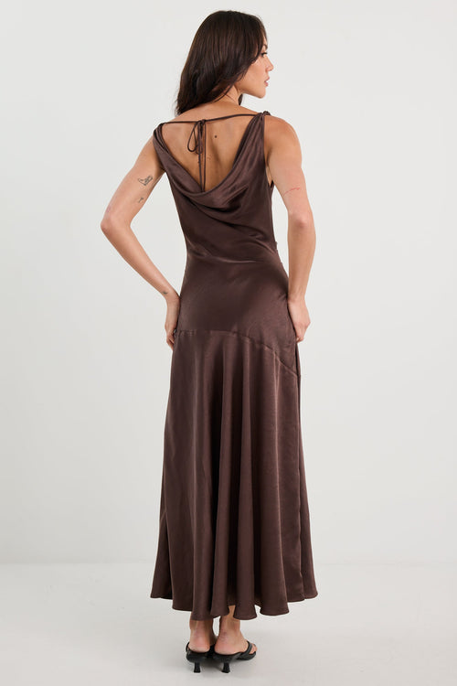 - Bias cut offers a flattering, flowing silhouette - Cowl neckline with soft folds adds gentle structure - Open back with strappy tie detail for a delicate finish - Rich chocolate satin with a subtle sheen - Fully lined for comfort and ease - Fabric - 100% polyester (delicate care recommended)