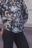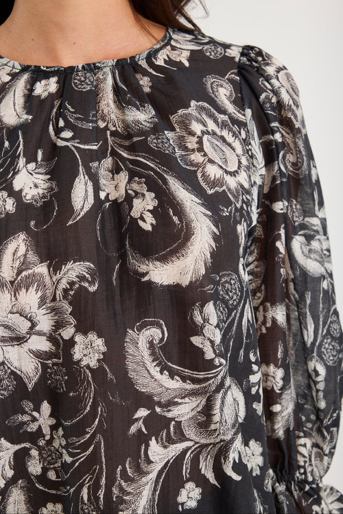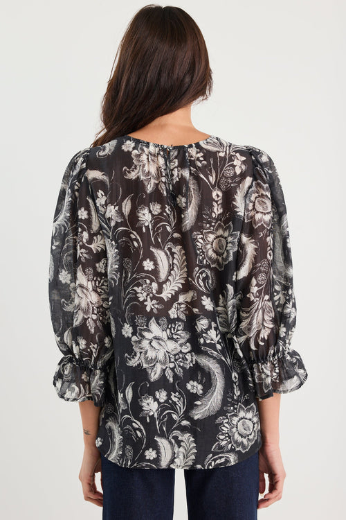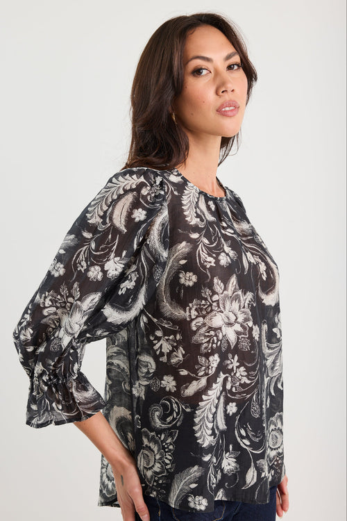 A soft statement piece, this top features an intricate ivory floral and foliage print sweeping across sheer black fabric. The crew neck and mid-length sleeves keep it classic, while gathered cuffs with frill detailing add an element of playfulness. Lightweight and breathable, it’s the perfect blend of elegance and ease.
