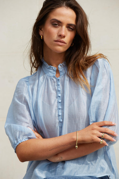 Start your day right in our Closure Pale Blue Top by Ivy + Jack. This chic sheer shirt features a sophisticated high-neck design complemented by delicate frill detailing, making it the perfect shirt for effortless, stylish outfits for work or formal occasions. Featuring a button-down front and mid-length balloon sleeves, this shirt is a linen blend offering both breathability and comfort, making it an ideal choice for various occasions. Available in a serene pale blue hue, it encapsulates effortless style.