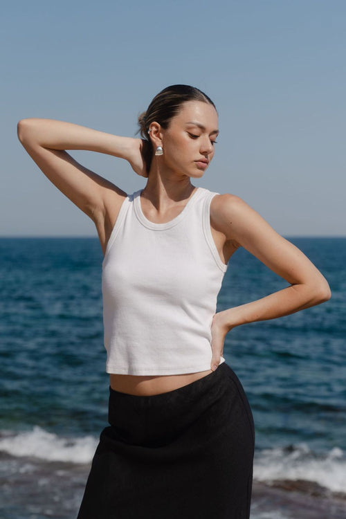 The Cobble Tank from RE:Union Label is a sleeveless stretchy rib knit tank that will fit snug and keep you cool all summer. Effortlessly versatile, this simple white summer tank that pairs well with a variety skirts, pants and shorts.