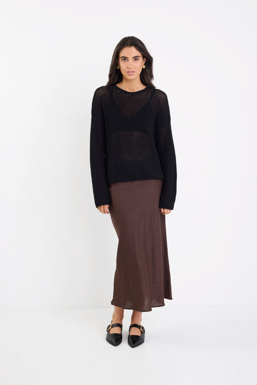 The Dawn Crochet Knit Jumper from RE:UNION Label combines comfort with easy wearability, making it a staple piece across the seasons. Made from 100% cotton, this lightweight knit works just as well as a breezy summer layer over swimwear as it does in cooler months when styled over a cami or layered under a coat. The relaxed fit and detailed crochet pattern give it a refined yet laid-back look that complements both casual and dressier outfits.