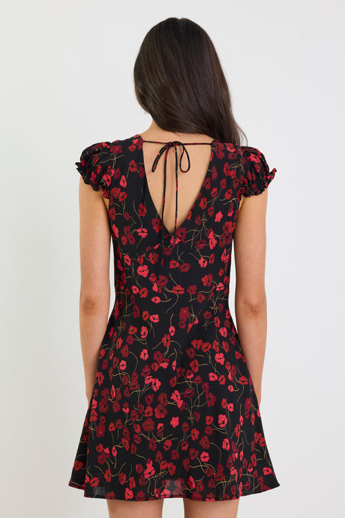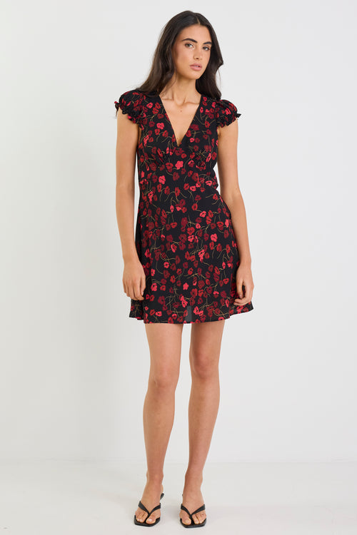 Derry Black Poppy Print Lightweight Cap Sleeve V Neck Mini Dress