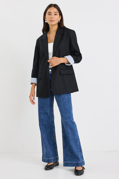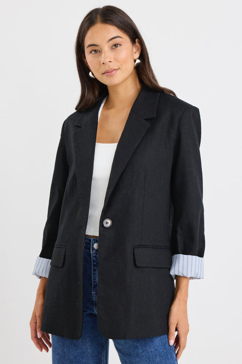 model wears a black linen blazer with blue stripe lining