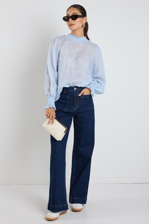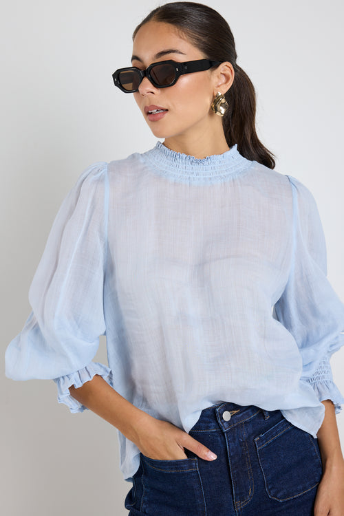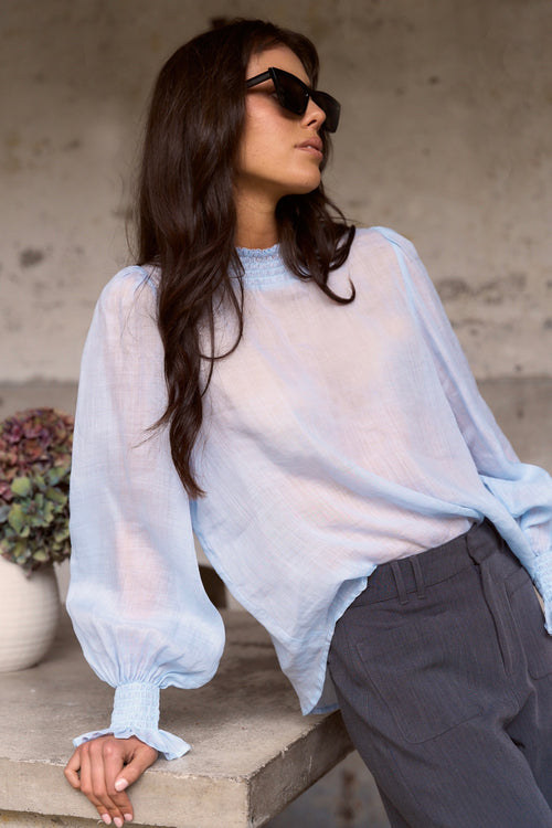 Woman wearing a light blue, long-sleeve, high-neck shirred blouse in a sheer ramie fabric, styled with dark blue high-waisted jeans and black sunglasses.