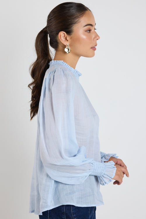 Embrace Ice Blue Ramie Shirred Neck LS Top