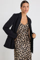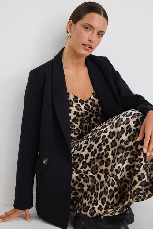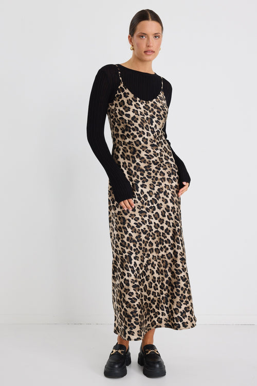 Woman wearing a leopard print midi dress with a tie waist and delicate spaghetti straps, styled with black heels for a bold, chic look.