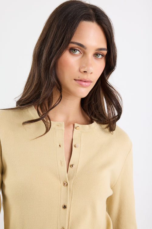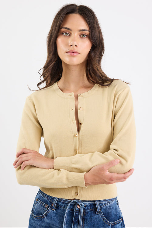 - Soft and breathable knit blend - Button front with subtle sheen hardware - Cropped fit with wide ribbed hem - Classic crew neckline and long sleeves - Fabric - 50% Viscose 28% Polyester 22% Nylon - Delicate, best cared for gently