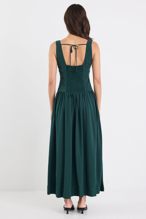 Say hello to your new go-to for effortless polish. The Gilded Forest dress is all about clean lines and soft movement, with a structured bodice, flattering square neckline, and a flowing maxi skirt that drapes beautifully. The shirred back adds a comfy fit, while the rich forest green brings a timeless, quietly luxe feel.