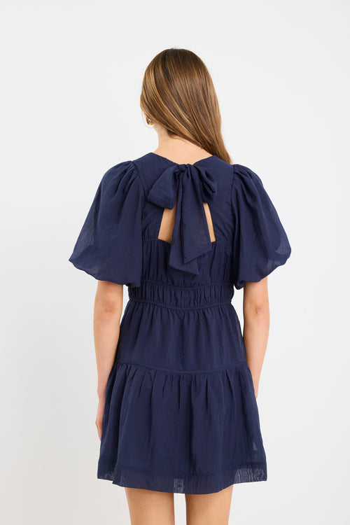 Girlfriend Navy Puff Sleeve Tie Back Mini Dress