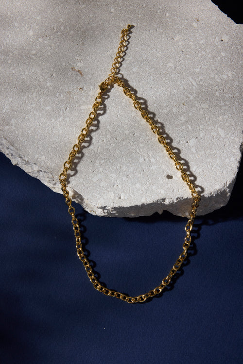 This timeless 14k gold-plated brass chain necklace features classic, rounded links for a sleek and polished look. Its versatile design makes it perfect for both everyday wear and layering with other pieces to create a bold statement. Ideal for adding a touch of elegance to any outfit, whether casual or formal.