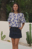 The Justify Top from By Rosa is a breezy, feminine blouse featuring an elegant blue lotus floral print on a soft cream base. Designed with blouson short sleeves that add volume and movement, it’s crafted from a lightweight rayon-nylon blend that drapes beautifully against the body. The relaxed silhouette makes it easy to pair with denim for casual days or elevate with tailored pants for a polished look.