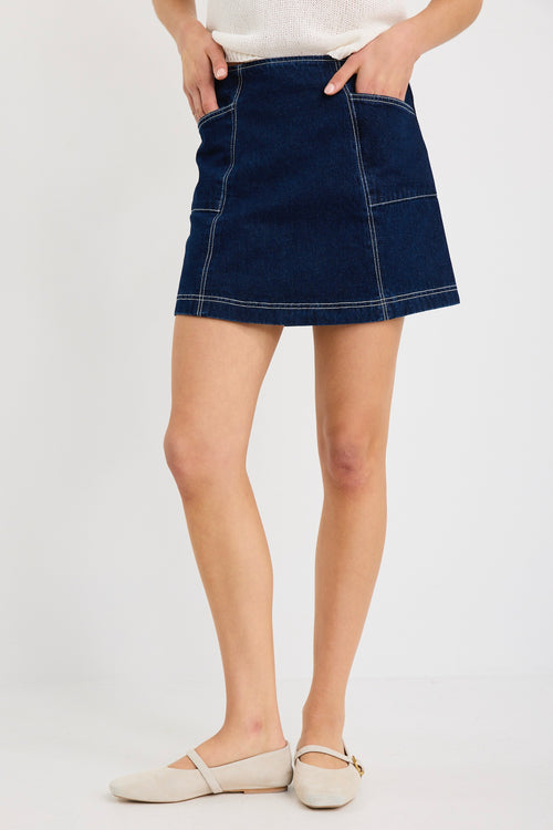 A timeless wardrobe staple, the Essential Mini Denim Skirt is designed for effortless transseasonal wear. Made from rich dark denim, it features two functional front pockets and a classic zip closure. Style it with a tee in warmer months or layer with tights as the weather cools for a chic, versatile look.