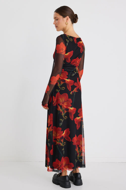 Location Red Floral Mesh LS Wide Neck Midi Dress