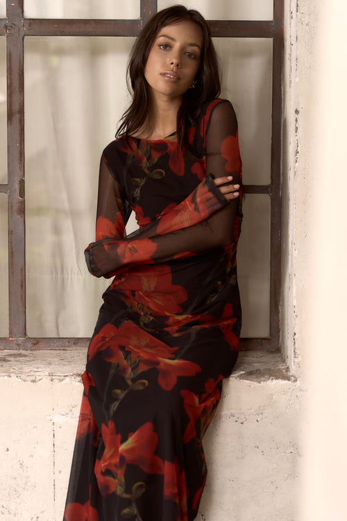 Woman wearing a black mesh maxi dress with bold red floral print, long sheer sleeves, and black chunky loafers.