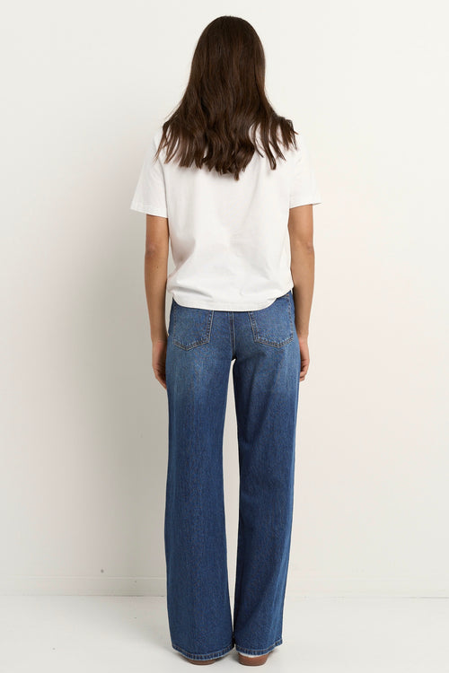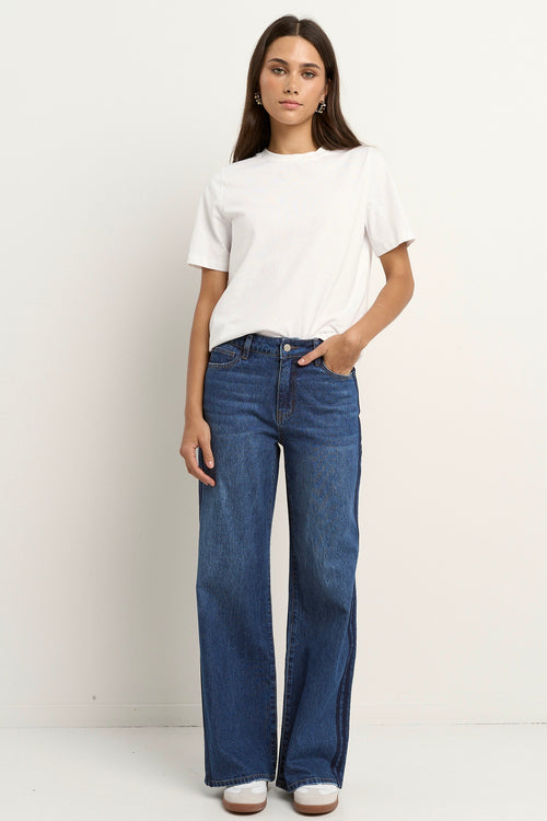 Woman wearing mid-blue wide-leg jeans with a dark side stripe and white t-shirt, styled with white sneakers against a neutral wall.