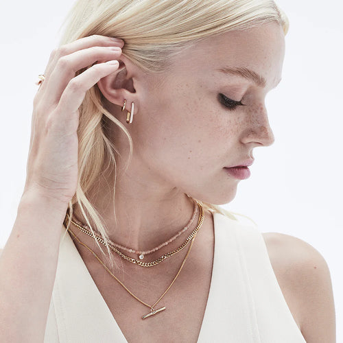 The Mara Chain Necklace consists of two chains, one shorter thicker and another medium length with a T-bar shape This necklace is perfect for layering or wearing on its own.