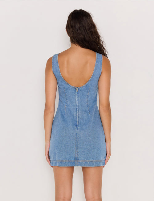The Miles Blue Denim Scoop Back Mini Dress from Mink Pink is a fresh take on a classic, blending clean lines with a flattering fit. Crafted from 100% cotton denim, it features a sleeveless design, crew neckline, and subtle panel seam detailing to contour the shape. The low scoop back with an exposed zip adds a touch of edge, making it perfect for both casual days and dressed-up nights.