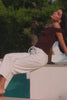 Woman wearing a chocolate brown off-shoulder sleeveless top with draped neckline, styled with white bottoms.