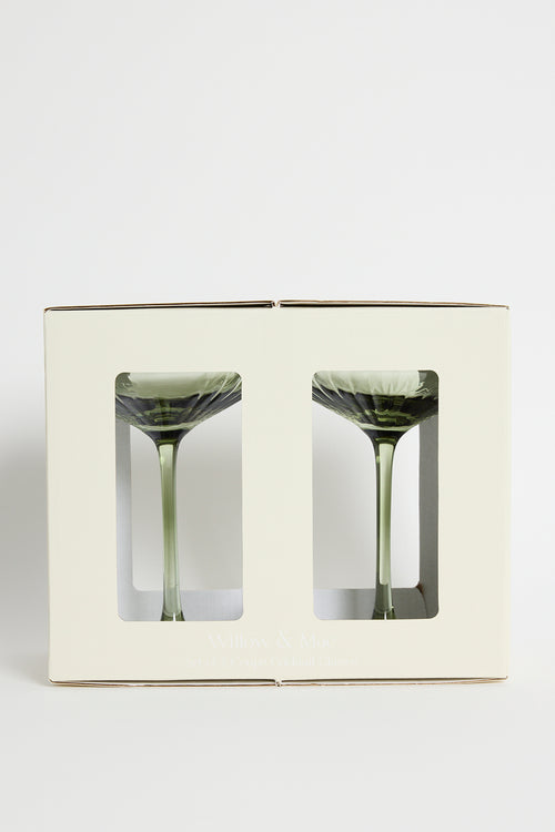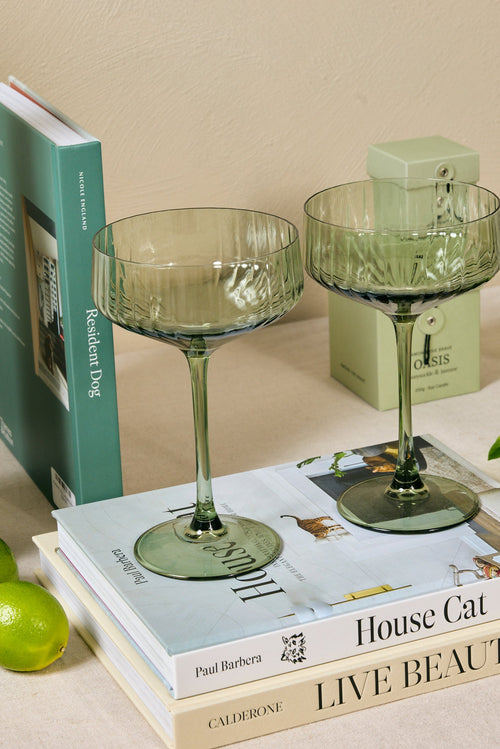 Olive Green Ribbed Set 2 Coupe Cocktail Glasses