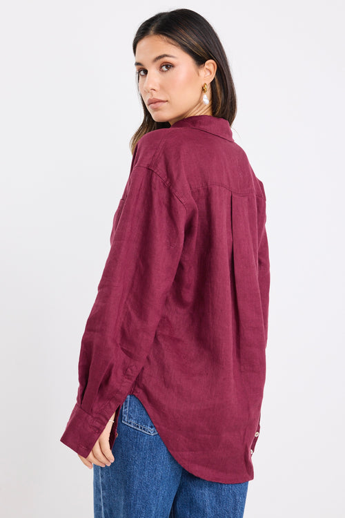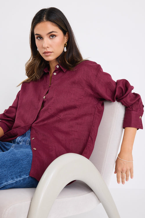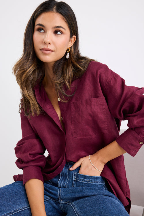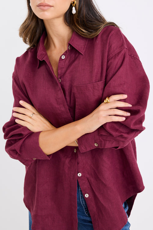 The Optimum Burgundy Plum Shirt is your easy answer to effortless style. Made from breathable, garment-washed linen, it feels soft against the skin and brings a lived-in charm to every outfit. Its relaxed oversized fit makes it perfect for high-low dressing with endless layering potential. Style it with: straight-leg jeans and slides for daytime ease, or tuck it into tailored trousers with gold hoops for a refined twist.