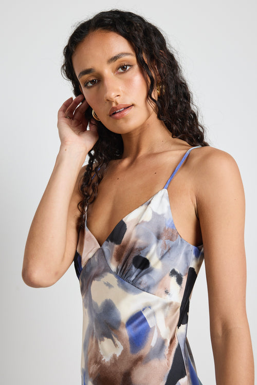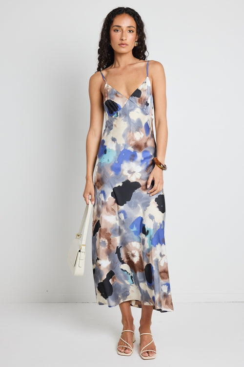 Woman wearing a bias-cut slip dress with strappy sleeves and a watercolour-style print in blue, brown, and cream tones. The dress has a silky, flowing texture and is styled with white heels and a cream shoulder bag.