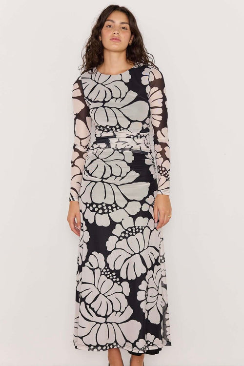 The cult-favourite mesh dress is back - now in a bold new monochrome. The Persephone Mesh Maxi Dress features the same figure-hugging silhouette you love, with a soft sheer overlay and eye-catching floral print. Effortlessly cool and ultra-flattering, this piece is made for after-dark plans or elevated day-to-night dressing.