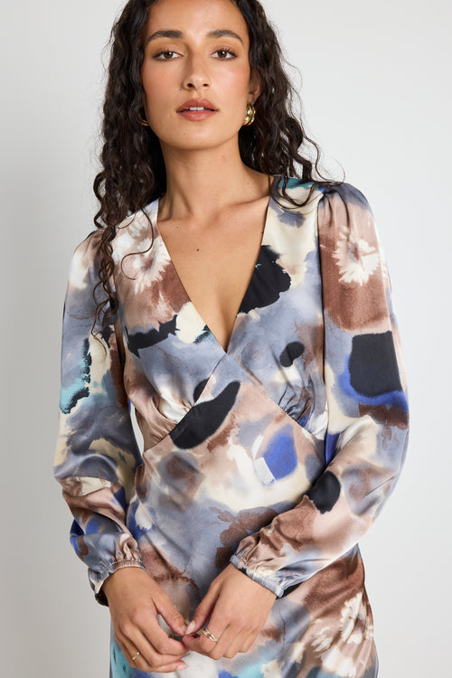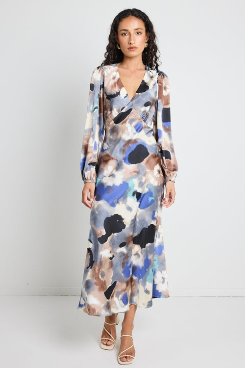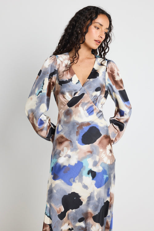 Phoenix Navy Multi Watercolour Satin Balloon Sleeve Midi Dress