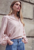 Softly tailored in a lightweight stripe weave, this long sleeve top blends feminine detail with everyday ease. Designed with a high ruffled neckline and a partial button front, it features subtle balloon sleeves with elasticated cuffs for a gentle blouson shape. The delicate blush hue and fine stripe lend a refined yet relaxed finish.