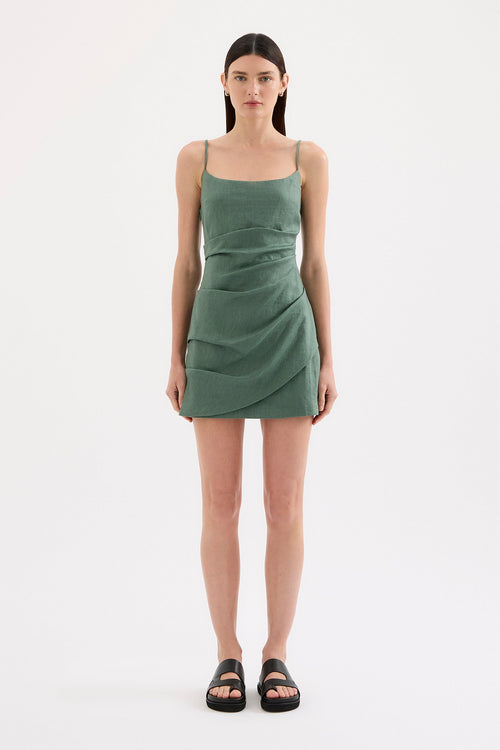 The Rani Linen Mini Dress is designed from a breathable 100% linen fabrication with a soft hand feel. This fitted, mini length dress features a flattering subtle scooped neckline and a draped design through body. This dress has adjustable, skinny straps and an invisible side zipper. This dress is fully lined.
