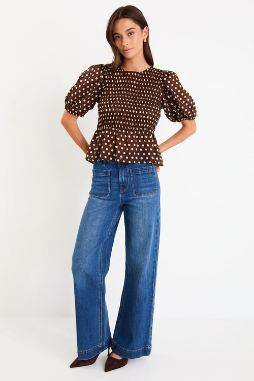 Model wearing a chocolate brown polka dot short sleeve top with a shirred bodice and peplum hem
