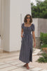 Woman wearing a navy maxi dress with vertical white stripes, short puff sleeves, a smocked waist, and side slit detail.