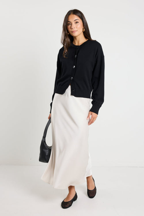 The Rosette Pearl Satin Bias Midi Skirt is crafted from smooth satin with a soft sheen. Cut on the bias for a graceful flow, it features a midi length and an elastic waistband for comfort. The midi length and lined construction provide full coverage, ensuring that you feel both stylish and comfortable throughout the day. Available in a pearl colour, this skirt is perfectly suited for a sophisticated look.