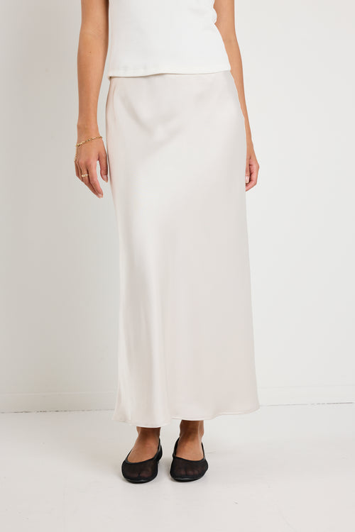 - Bias cut silhouette - Elastic waistband for comfort - Midi length skirt in pearl tone - Fully lined for added coverage - Fabric - 100% polyester