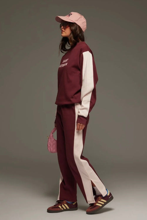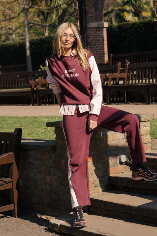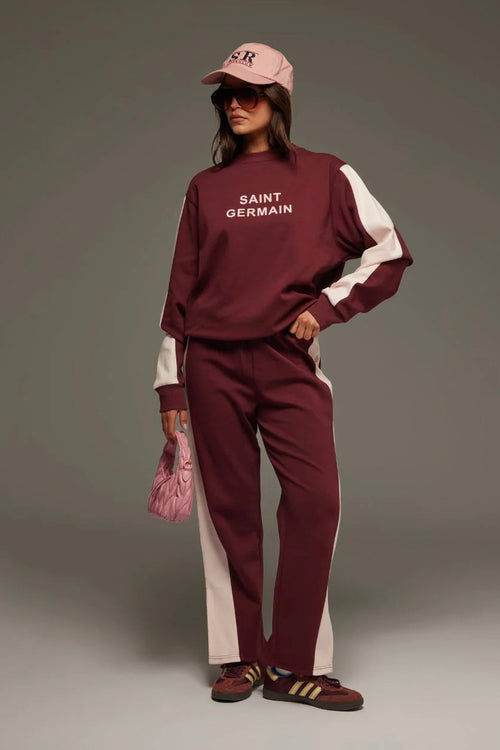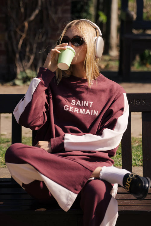 Introducing our Saint Germain Knit Sweatshirt in Red Wine. Thoughtfully crafted in a luxurious and soft cotton knit fabrication, with our exclusively designed velvet applique print on the front in a contrasting light blush hue. Our Saint Germain Knit Sweatshirt is effortlessly cool and pairs perfectly with our Saint Germain Knit Pant in Red Wine.