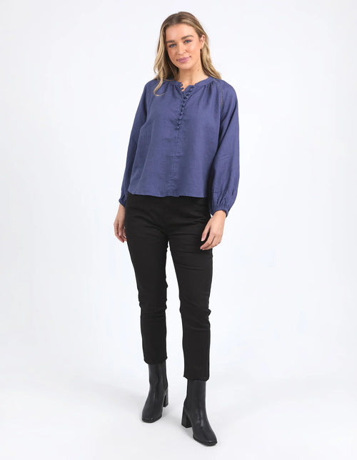 Foxwood Sardinia Blouse, featuring a mandarin-style collar neckline and a fabric-covered button on the half-neck placket. This luxe 100% Linen shirt has stylish elastic cuffed balloon sleeves.