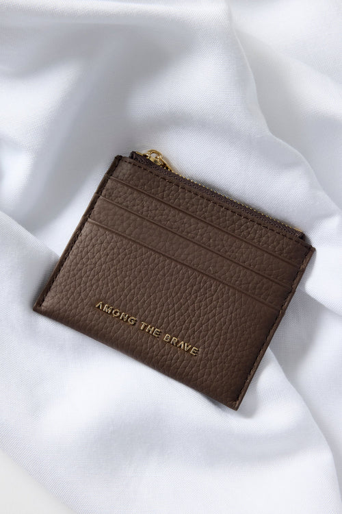 Compact and stylish, the Small Leather Card Holder by Among The Brave is your perfect on-the-go companion. Crafted from premium leather, it features a sleek gold embossed "Among The Brave" logo and a matching gold zip closure. Designed for convenience, it includes front card slots for easy access and a secure zip pocket for your coins.