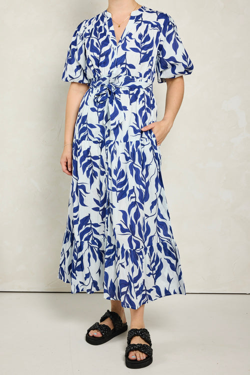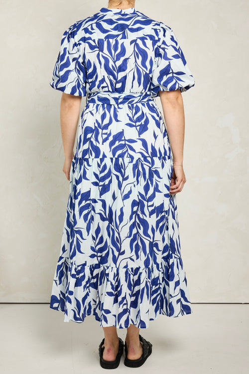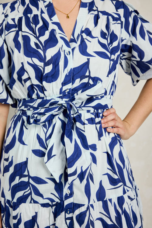 Solution Blue Leaves Print SS Tiered Shirt Dress