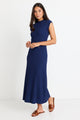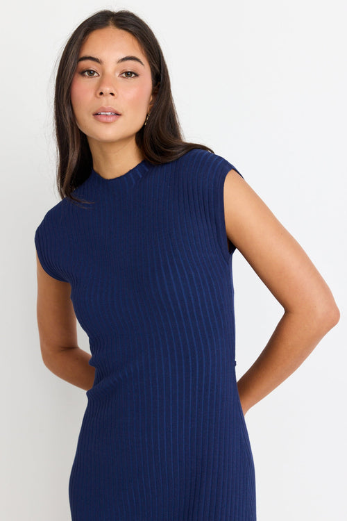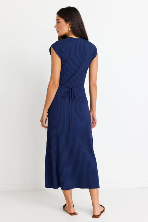 Woman wearing a navy blue rib knit maxi dress with a fitted silhouette