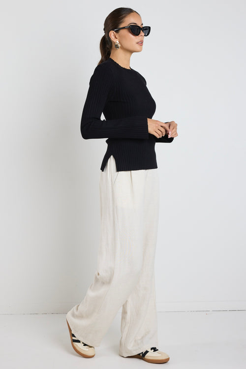 model wears a black long sleeve top with white pants
