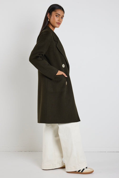 Woman wearing a long khaki coat with tort buttons and wide-leg ecru jeans, looking over her shoulder in profile.